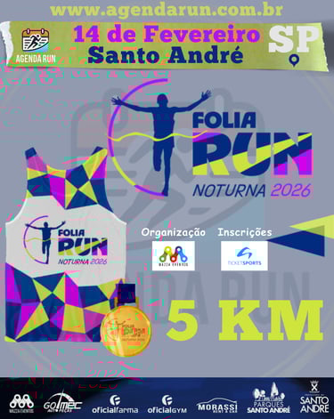 Já pode ir preparando a fantasia porque o pré-carnaval em Santo André vai ser correndo! 🎉 A Folia Run Noturna convida você para uma prova de 5km cheia de alegria, música e brilho no Parque Central.