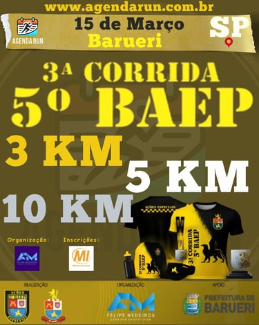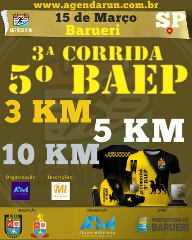 Atenção, pelotão! Está chegando a 3ª edição da corrida do 5º Batalhão de Ações Especiais de Polícia em Barueri. Uma prova com a energia e disciplina da tropa, perfeita para quem busca superação. 👊🏃♂️