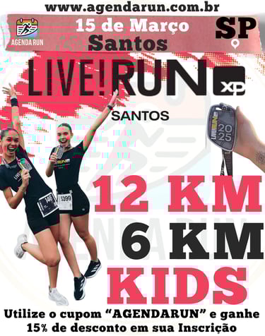 Muito além da corrida, um momento de vibração e conexão! A LIVE! RUN XP chega a Santos com distâncias de 6km e 12km, além da Corrida Kids, para agitar o litoral paulista. Aproveite a Arena LIVE! no Emissário Submarino e venha superar seus limites com o pé na areia (ou quase!). Vamos nessa?