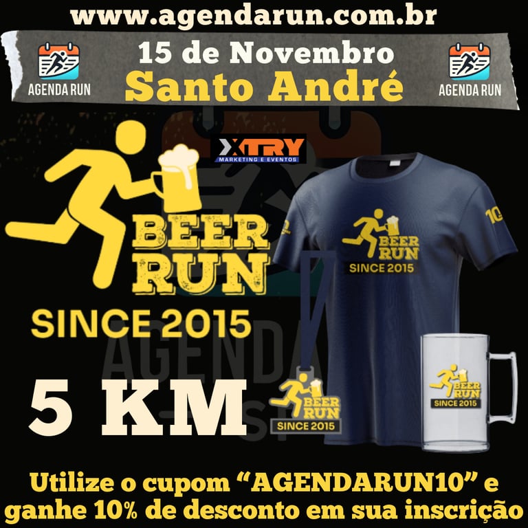 No dia 15 de novembro o Beer Run chega nos seus 10 anos com festa temática, corrida de 5km e experiência única no Paço Municipal de Santo André. O evento mistura corrida e degustação de cerveja artesanal, conta com arena de música, gastronomia e entrega de kits especial. Prova noturna (largada às 20h), sem chip nem classificação, criada para garantir diversão, integração e momentos inesquecíveis entre amigos e amantes do esporte — só maiores de 18 anos podem participar. Para garantir ainda mais vantagem, basta usar o cupom "AGENDARUN10" e garantir 10% de desconto na inscrição!