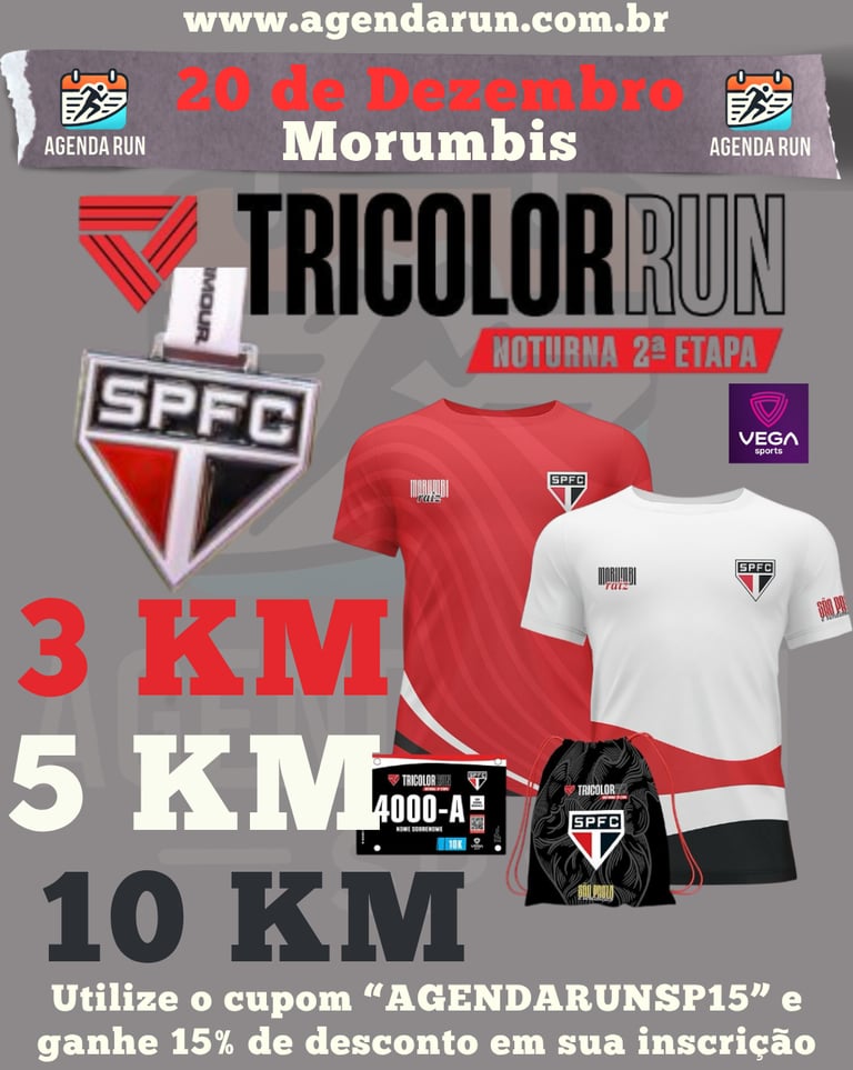 Vista o manto e venha sentir a energia da torcida na pista! A Tricolor Run Noturna 2025 – 2ª Etapa é a corrida oficial do São Paulo FC, com largada e chegada no icônico Estádio do MorumBIS!