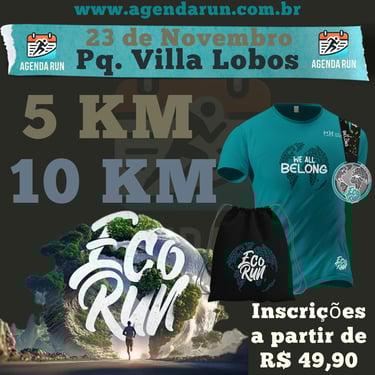 No domingo, 23 de novembro de 2025, o Parque Villa Lobos recebe a Eco Run, corrida temática pela conscientização ambiental com opções de 5 km e 10 km. O kit inclui camiseta, sacochila e medalha (para quem concluir), além do chip de cronometragem e número de peito. Os atletas participam em pelotões por ritmo: Quênia (abaixo de 5'00"/km), Azul, Verde e Branco conforme experiência. Premiação para os três primeiros no geral masculino e feminino de cada distância. Guarda-volumes disponível, retirada de kits e detalhes de largada divulgados em breve pelo site da organização. Inscrições com preço acessível graças à Lei de Incentivo ao Esporte, com descontos de 50% para idosos, estudantes e PCDs.