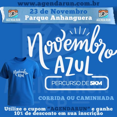 CORRENDO PELA VIDA NO NOVEMBRO AZUL! 💙🏃♂️ Mais do que uma corrida, este é um movimento de conscientização! Vista a camisa azul e venha correr no Parque Anhanguera para apoiar a saúde masculina e a prevenção ao câncer de próstata.