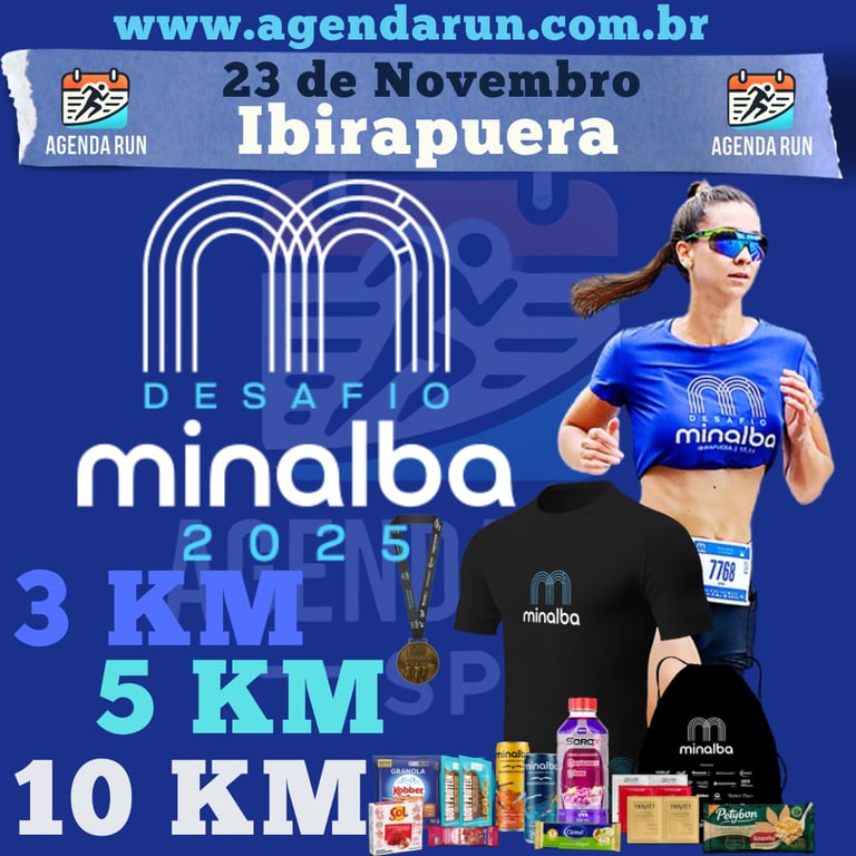 No dia 23 de novembro, São Paulo recebe a terceira edição do Desafio Minalba, oferecendo experiências exclusivas com percursos de 3 km (caminhada), 5 km e 10 km (corrida) no “melhor percurso da cidade”, com largada em frente à ALESP e arena cheia de atrações. O kit premium traz camiseta e sacochila Liquido, além de medalha, número de peito e cashback de mais de R$ 1.800 em serviços, acessórios, cinema, sessões de cuidados e aulas. Aproveite: com o cupom “AGENDARUN10” você garante 10% de desconto na inscrição.