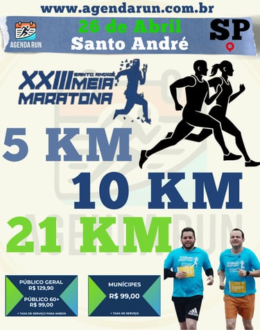 A prova mais tradicional do ABC Paulista está confirmada para a sua 23ª edição! A Meia Maratona de Santo André é o desafio perfeito para quem busca correr 5K, 10K ou os desafiadores 21K no coração da cidade.