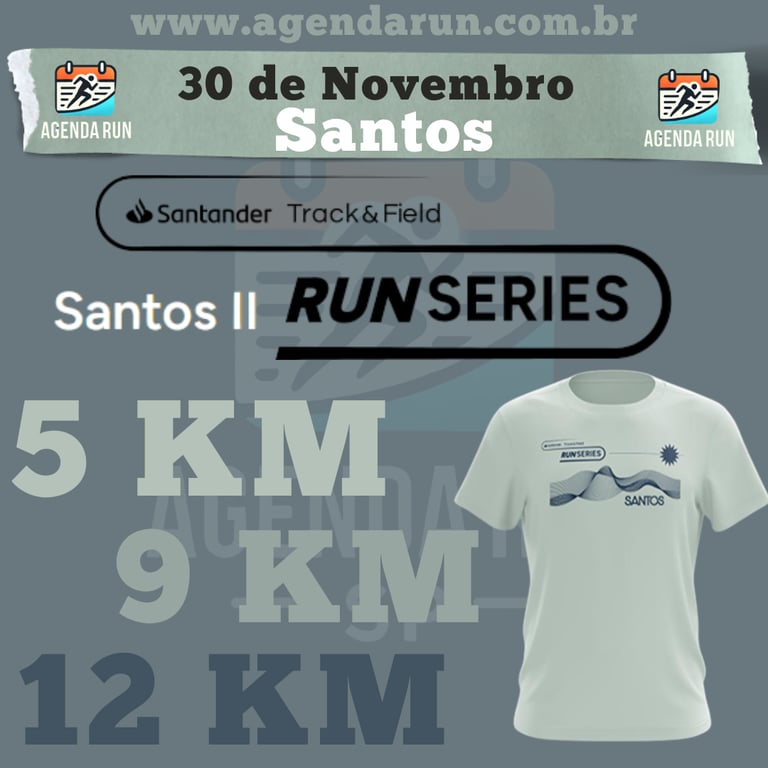 No dia 30 de novembro, a Arena será montada em frente ao Aquário Municipal de Santos para a etapa Track&Field Run Series Santos II, com percursos de 5 km (largada 7h30), 9 km (6h40) e 12 km (5h45). Inscritos recebem kit exclusivo (camiseta, gym bag, brindes); medalha colecionável ao concluir a prova. O circuito preza por inclusão: PCD tem isenção na inscrição do tipo número de peito e metade do valor em inscrições completas; clientes Santander contam com desconto especial. A estrutura oferece credenciamento pelo app, banheiros, áreas de experiência e retirada de kit de 27 a 29/11 na loja Track&Field Ponta da Praia. Troféus aos cinco melhores atletas gerais masculinos e femininos das três distâncias; não há classificação por idade.