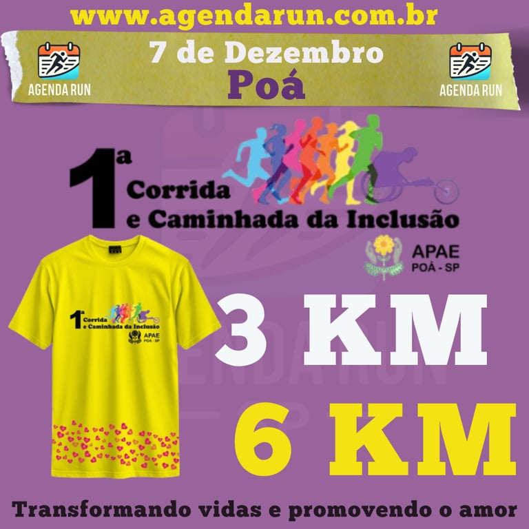 No dia 7 de dezembro de 2025, a APAE Poá sedia sua primeira corrida e caminhada inclusiva! O evento traz caminhada participativa de 3 km para todos os públicos e corrida cronometrada de 6 km, com premiação para os mais rápidos no geral e categorias específicas de inclusão. Todos que cruzam a linha de chegada recebem medalha – com inscrição a partir de R$ 65, kits exclusivos e condições especiais para atletas PCD. Organizado em parceria com a Runners Suzano, a prova reforça o papel do esporte na inclusão social, visibilidade e superação.