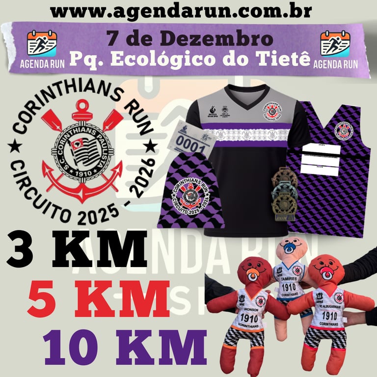 No dia 7 de dezembro de 2025, o Parque Ecológico do Tietê será tomado pela vibração alvinegra! A Corinthians Run desembarca com percursos de 5 km, 10 km e caminhada 3 km, além da animada Cãominhada para pets e seus donos. Kits completos e exclusivos, premiação para as melhores colocações, ação social (doação de alimento, leite ou absorvente), descontos para PCD e ambiente pensado para toda a família tornarem essa etapa inesquecível para a Nação Corinthiana.