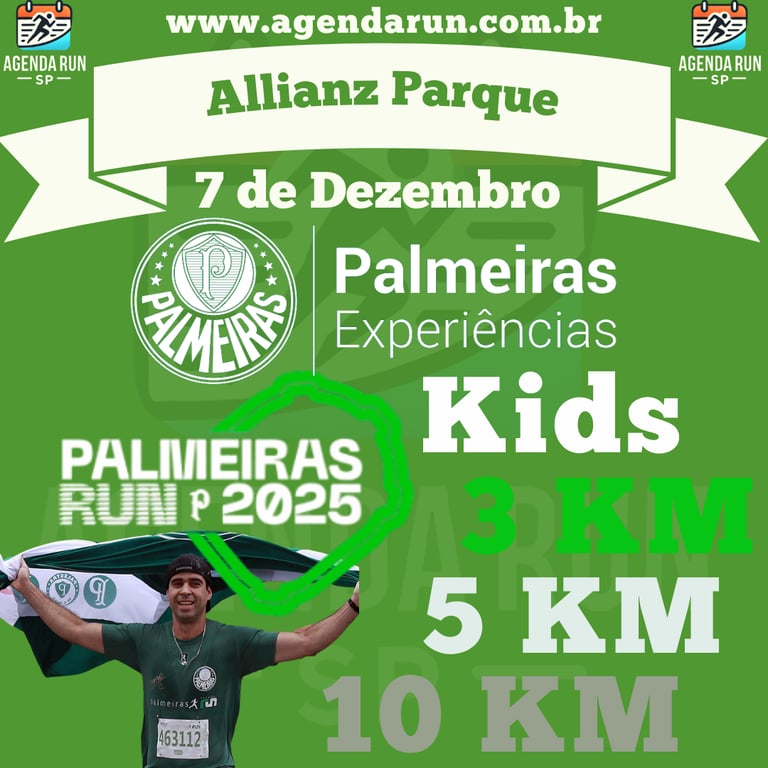 A corrida mais apaixonada pelo Verdão está de volta! Dia 07 de dezembro de 2025, vista sua camisa, junte a família e amigos e venha correr nas ruas de São Paulo em mais uma edição histórica da PALMEIRAS RUN!