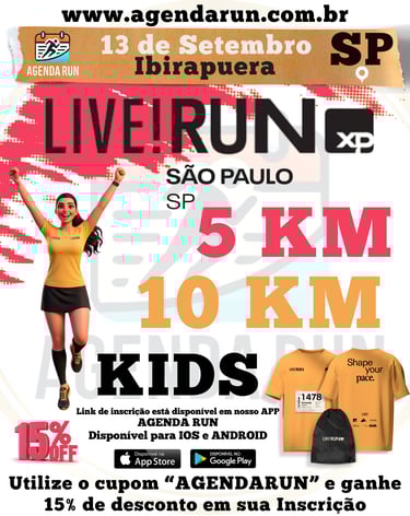 Preparem o fôlego! A terceira etapa de 2026 do circuito LIVE! RUN XP na capital paulista está confirmada para setembro. Prepare-se para correr em um dos cenários mais icônicos de São Paulo, na região do Ibirapuera. Com a infraestrutura premium que é marca registrada do circuito, a prova oferece percursos rápidos e uma arena repleta de ativações, música e bem-estar. Seja para buscar o seu recorde pessoal ou para curtir uma manhã de esporte com a família, essa etapa é imperdível!