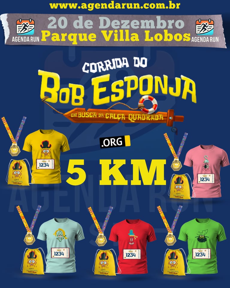 Atenção, marujos! Junte-se ao Bob Esponja, Patrick, Lula Molusco e toda a turma na Corrida Bob Esponja: Em Busca da Calça Quadrada! Uma aventura inspirada no novo filme, perfeita para correr e se divertir com a família!