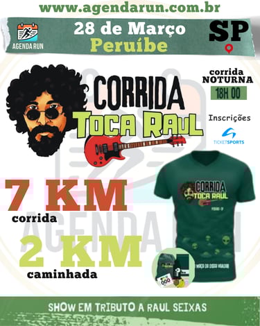 Prepare o seu tênis para a corrida mais rock'n'roll do litoral! A Corrida Toca Raul! em Peruíbe é uma festa que começa com 5K de corrida ou 2,5K de caminhada e termina com um show tributo incrível e praça de alimentação. Venha viver essa sociedade alternativa!