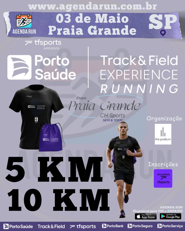 Prepare-se para sentir a energia do mar e superar seus limites! A Track&Field Experience chega à Praia Grande trazendo toda a exclusividade e infraestrutura de um dos maiores circuitos de corrida de rua da América Latina. Com um cenário incrível e o clima vibrante do litoral, cada passo será acompanhado pela brisa do mar, proporcionando aquela sensação única que só o pé na areia e o asfalto da orla oferecem. Seja para bater seu recorde pessoal nos 10km ou para viver sua primeira experiência nos 5km, este evento é o convite perfeito para unir esporte, saúde e uma vista de tirar o fôlego. Garanta sua inscrição pelo aplicativo TF Sports e venha largar rumo à sua próxima conquista!