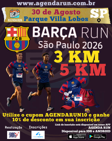 "Més que un club", agora "Més que uma corrida"! A Barça Run São Paulo 2026 convoca todos os fãs do FC Barcelona e apaixonados por corrida para um evento épico no Parque Villa-Lobos. Vista as cores blaugranas e venha sentir a energia do Camp Nou em solo paulistano! Com percursos de 5 km (corrida) e 3 km (caminhada), o evento é perfeito para toda a família e conta com kits exclusivos e oficiais do Barça. Aceite o desafio e venha fazer parte desta festa do futebol e do desporto!