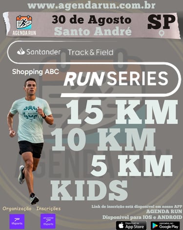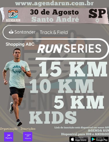 📅 Data: Domingo, 30 de agosto de 2026 📍 Local: Shopping ABC (Av. Pereira Barreto, 42 – Vila Gilda, Santo André/SP) ⏰ Largadas: 05h45 (15km) | 06h30 (10km) | 07h20 (5km) | 08h45 (Kids) 🏃 Distâncias: 5km, 10km, 15km e Kids