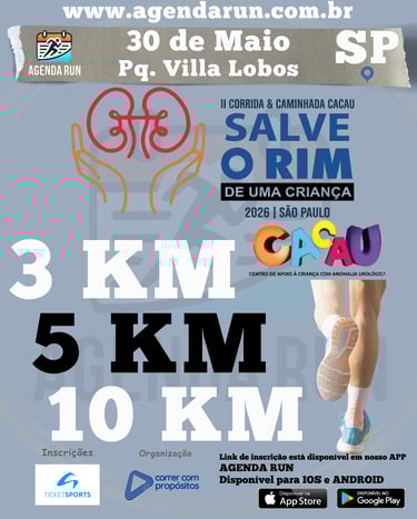 Prepare o coração e o fôlego para correr por uma causa nobre! A II Corrida e Caminhada CACAU chega ao Parque Villa-Lobos com uma missão especial: conscientizar sobre as doenças urológicas na infância e arrecadar fundos para a ONG CACAU. Este é um evento 100% beneficente, onde cada quilómetro percorrido ajuda a transformar a vida de milhares de crianças. Seja nos 10 km, 5 km ou na caminhada de 3 km, venha fazer parte desta corrente de solidariedade e mostre que o desporto pode salvar vidas!