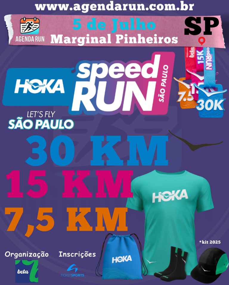 Prepare-se para voar baixo na Marginal! A Hoka Speed Run chega em julho com aquele percurso plano e rápido que a gente ama para buscar o RP. 🏃♂️💨